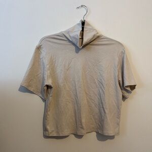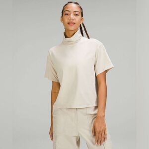 Effortless everyday tee from Lululemon featuring a relaxed fit and soft cotton-blend fabric. Designed with a chic mock/turtleneck neckline and short sleeves for an elevated casual look. Perfect for layering or wearing on its own.
