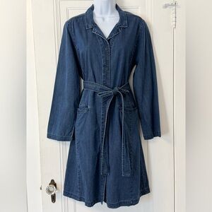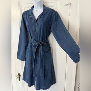 Stylish denim shirt dress with a belt. Features a classic collar and button-down front.