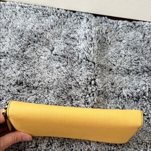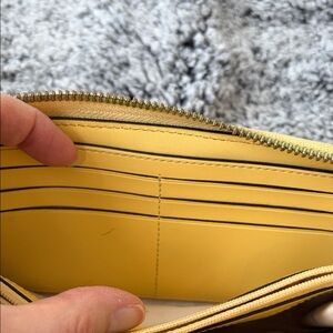 Kate Spade large continental wallet in a lovely shade of butter yellow. Coated canvas Zip around closure with multiple card slots and interiors compartments. Some wear in the coin pouch and around the zipper. Small spot of discoloration on the front as shown in photos. 7.5" x 4"