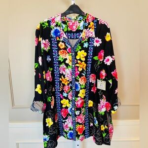 John Mark NWT 1X Tunic Black Floral Button Down High Contrast Roll Tab Bold $119