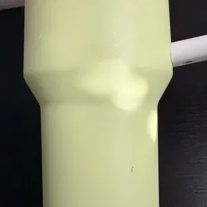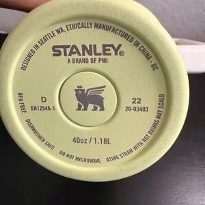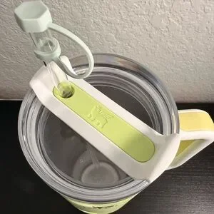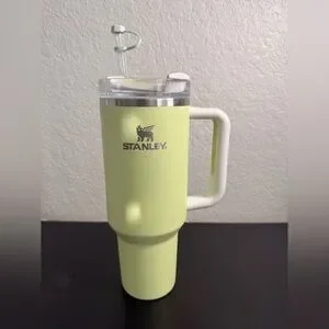 Light green Stanley mug with a clear lid and straw. Features a durable handle.