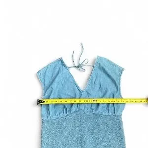 Trendy light blue crop top with smocked waist. Sleeveless design with tie-back detail. Perfect for casual outings.