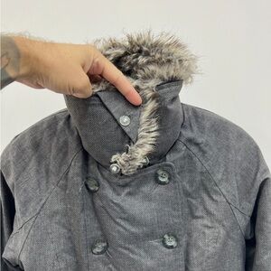 Stay warm and stylish with this elegant double-breasted coat featuring a luxurious removable faux fur collar. Water resistant shell in a faux twill pattern to mimic wool. Perfect for any occasion.