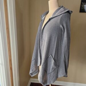 This stylish Calvin Klein Performance sweater is perfect for a casual, comfortable look. It features a trendy black and white striped pattern, a cozy waffle knit texture, and an open-front waterfall design with a hood.