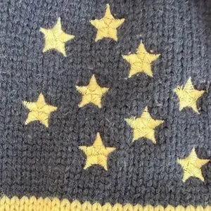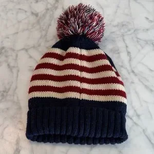 Cozy knit beanie featuring a patriotic design with stars and stripes. Topped with a playful pom-pom.