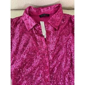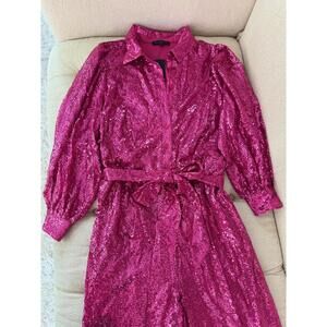 Eloquii Hot Pink Sequin Jumpsuit featuring a collared neckline and button-front detail. This wide-leg jumpsuit is adorned with sparkling sequins throughout, perfect for holiday glam or party wear. Includes a matching belt to accentuate the waist. Ideal for plus size fashion, size 20. Stylish and comfortable for festive occasions or New Year celebrations.