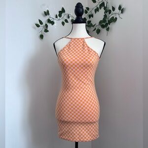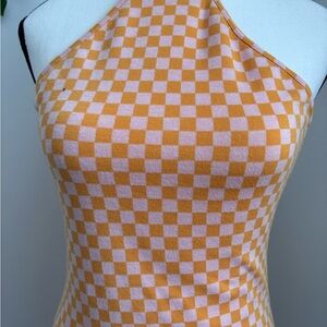 Bershka Orange and White Checkered Halter Mini Dress Size XS open back