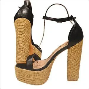 Black Platform High Heel Sandals With Woven Straw Sole & Ankle Strap Heel Chic