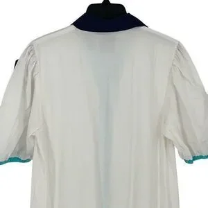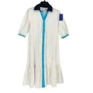 ADDISON BAY ISLE DRESS 100% Poplin Cotton White Blue Pipping Drop Waist Midi Small