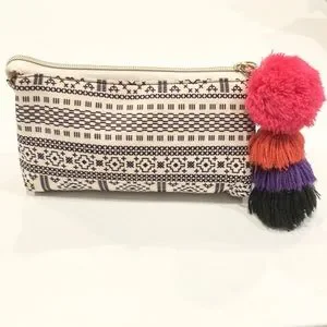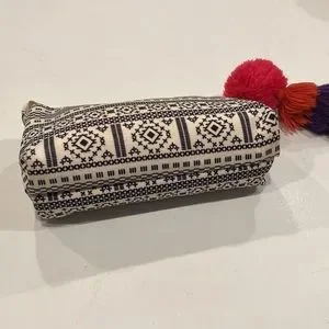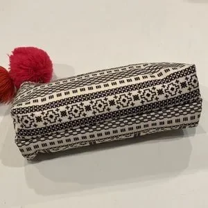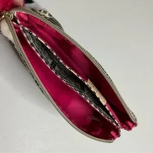 So cute it can be used as a mini clutch. Top zipper closure has long rectangle gold tone charm & four layer pom pom charm attached. Open to reveal double center divider creates 3 compartments. Hot pink lining. Measurements flat are approximately 7.5” wide x 4.5” tall. In great preowned condition with NO spots or damage.