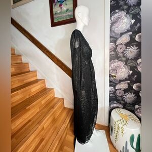 Description A subtle metallic sheen makes a glamorous finishing touch for this ankle-length dress with long, sheer sleeves and a timeless silhouette.