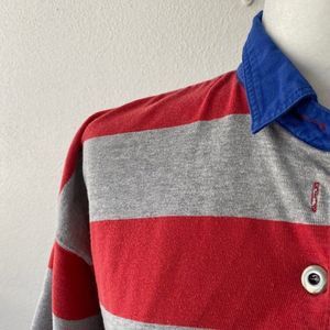 Liz Claiborne Vintage Lizwear Red Gray Cotton Striped Polo Long Sleeve Shirt SZ L