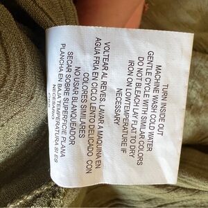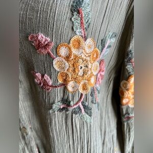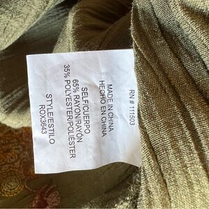 Stylish olive green blouse with button-up front and beautiful embroidered details. Pearl buttons at front and on cuffs, sleeves can be rolled up and secured with tab. Comfortable and soft rayon material. Women’s size large. No flaws, stains or tears. Great condition.