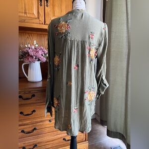 Fig and Flower Olive Green Embroidered Button-Up Long Sleeve Blouse Tunic