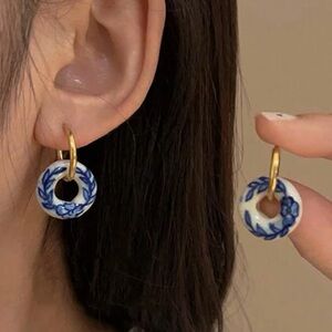 Stunning and unique, these earrings feature mini gold hoops with blue-and-white porcelain-style donut charms. The delicate floral detail makes them timeless yet trendy — perfect for elevating any outfit.