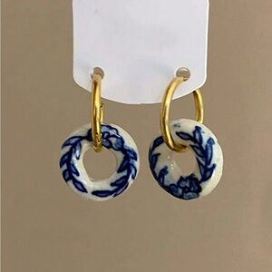 Blue White Porcelain Hoop Earrings Gold Small Hoops with Floral Ceramic Donut