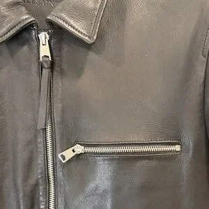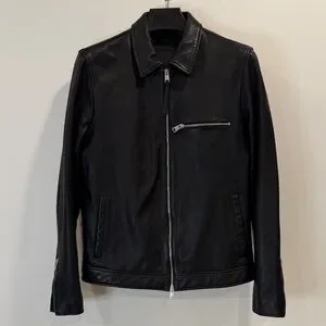 Stylish black leather jacket. I’ve never gotten more compliments over a piece of clothing. The perfect clean design and fit. Features zippered chest pocket. Classic collar and sleek design. O-1