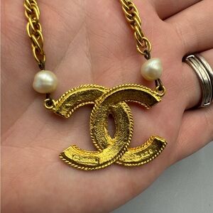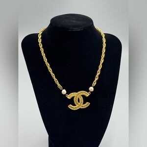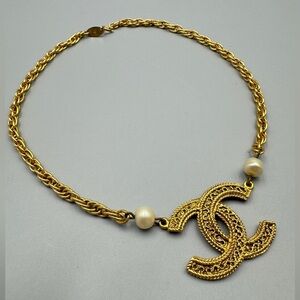 Elegant vintage gold Chanel CC necklace featuring a classic design with pearl accents. Perfect for adding a touch of sophistication to any outfit.