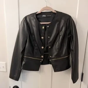 Sleek black leather jacket by Zara. Features gold buttons and zippers. Perfect for a stylish look.