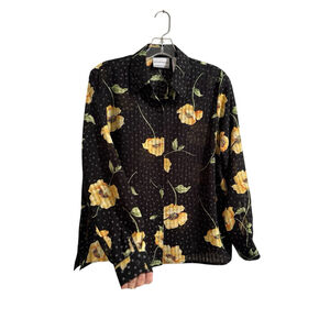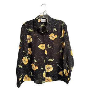 Alfred Dunner Floral Button Down Sheer Blouse Womens 8P Black Gold Long Sleeve