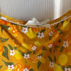 Bright yellow one-piece swimsuit with floral/lemon pattern. Features thin straps and a vibrant design.