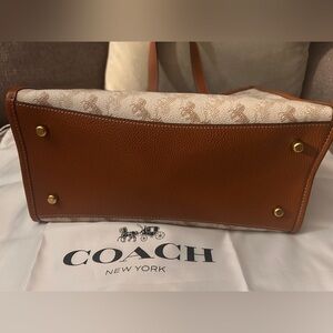 Stylish Coach tote with tan leather accents. Cream canvas with iconic logo. Ideal for daily use.