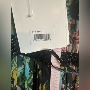 This floral print chiffon midi dress has a high round neckline, semi-sheer flutter sleeves, and a pleated midi-length skirt. A black hand-beaded belt accents the natural waist.