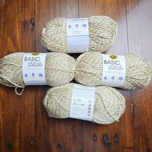 Five skeins of Lion Brand Basic Stitch anti-pilling yarn in Tan/White. Each skein contains 3 ounces or 85 grams, providing 157 yards or 144 meters of yarn. This medium weight yarn is 100% acrylic, machine washable and dryable. Recommended needle size for knitting is 8 (5 mm) and hook size for crochet is H-8 (5 mm).