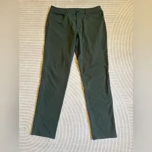 These Lululemon ABC Pant in size 34x33 are a Green color classic-fit trouser made from Performance polyester fabric. It features a mid-rise, zip closure, and straight leg style for a preppy and casual look. The pants have a lightweight and comfortable design with stretch material, making them suitable for travel, casual, Office and business occasions. They are easy to care for and machine washable, perfect for everyday wear. With a flat front and logo accents, these pants offer both style and functionality for modern men on the go.pre-Owned good condition.