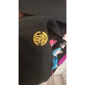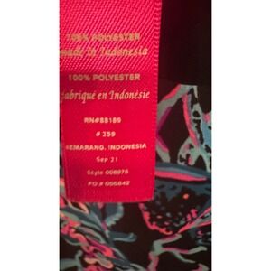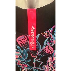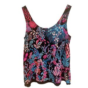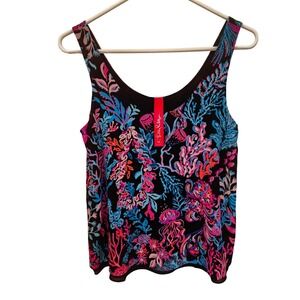 Lilly Pulitzer sleeveless tank top features a vibrant ocean-inspired coral and jellyfish print on the front with a solid black back. This lightweight piece is designed with a scoop neckline and a relaxed fit, making it perfect for warm-weather styling or layering. The gold-tone logo charm at the hem adds a signature touch of luxury to the breezy silhouette.