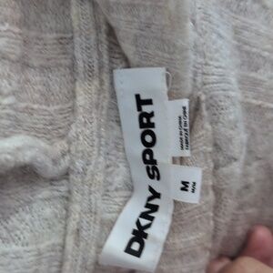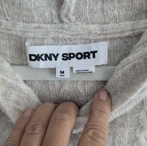 DKNY oversized hoodie sweater features intricate cable knit design.