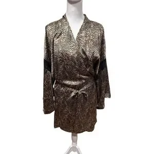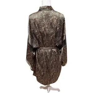 The Victoria's Secret Leopard Print Slip Dress size large and Wrap Around Lace Satin Robe in size Med/Lg is a stunning and luxurious set perfect for any vintage-loving woman. Made from satin material in a sexy brown color, this outfit exudes elegance and sophistication. The robe's wrap-around design adds a touch of glamour, while the slip dress offers a sleek and chic silhouette with adjustable straps and lace inset. Ideal for special occasions or relaxing at home, this retro-inspired ensemble from Victoria's Secret is sure to make a statement.