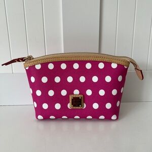 Used Dooney & Bourke cosmetic case in fuchsia and white polka dots shows little to no signs of wear. Has a few scratches on the hardware and small creases on the vachetta leather.