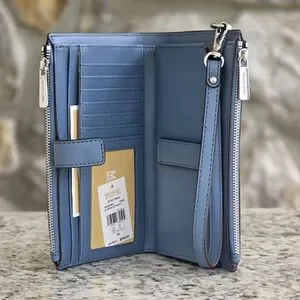 Interior of wristlet: ID window, 6 CC slots, 2 slip pockets, & 1 phone slip pocket. (6.75" x 3")