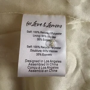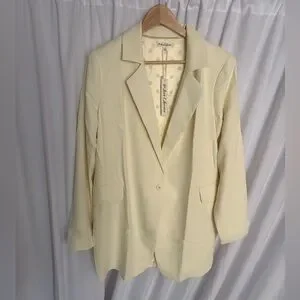 New with tags For Love & Lemons “Courtney” blazer in a butter yellow recycled poly suiting fabric. Boxy boyfriend fit with notched lapels, faux flap pockets and single button closure. Fully lined and perfect over jeans, trousers or dresses for an effortless statement look. From a smoke-free, pet-free home.