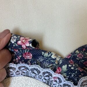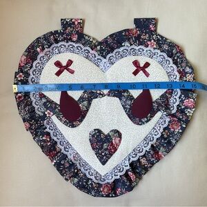 Heart-shaped wall decor with floral fabric and lace trim. Features burgundy bows and heart accents. Perfect for adding charm to any room. There are loops at the top for wooden dowel to make this easier to hang