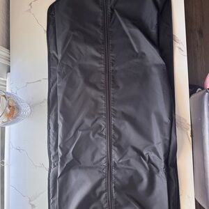 Black zippered garment bag in brand new condition. Great for storing or traveling with suits, dresses, coats, or uniforms. Helps keep clothes clean and wrinkle-free. Lightweight and easy to hang.