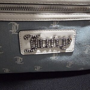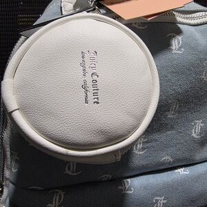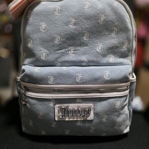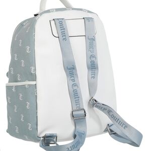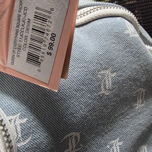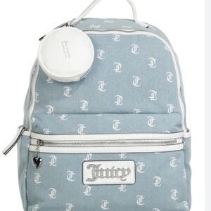 Stylish blue denim backpack with Juicy Couture logo print. Features a front zip pocket, a pocket on each side, and a small attached pouch.