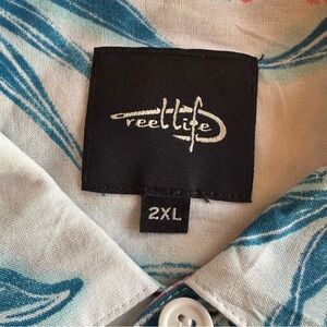 Get ready for your next getaway or fishing trip with this vibrant Reel Life short-sleeve button-down. Featuring a fresh tropical print with coral hibiscus flowers and teal/blue palm fronds on a crisp white background. This shirt is lightweight, breathable, and designed for outdoor comfort.