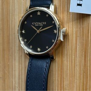 Coach Grand Watch 14504074 With 36mm NavyBlue Face With Golden / Yellow Gold Tone Stars hour markers & Golden Hands & Bezel & 18mm Wide Navy Blur Leather Band. Its Original Retail Price is $195 & Overheads. V Beautiful Watch.