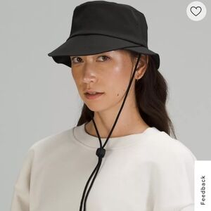 Lululemon Women's Wide-Brim Bucket Hat with Strap in size XS/S, never worn. This reversible hat has a longer brim on one side to give your face extra shade. Turn it around to protect your neck as the sun moves across the sky. Sweat wicking, quick drying. Perfect for hiking, outdoor activities, gorpcore, techwear, granola girl wardrobes.