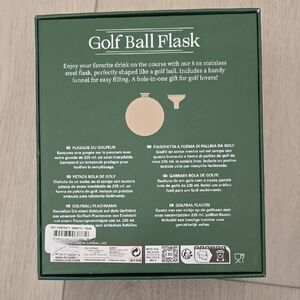 Stylish stainless steel silver flask shaped like a golf ball. Comes with a convenient funnel. Perfect for golf lovers.