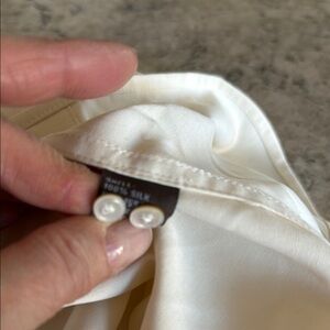 NWT 100% cream colored silk (like, sueded silk) shirt with front pocket flaps. Long cuffed sleeves. Coordinated blue and gold silk scarf. Size L