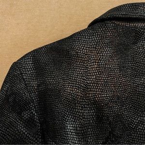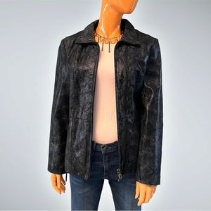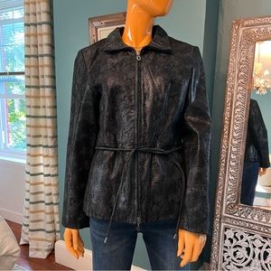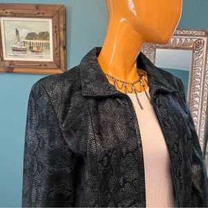 EUC genuine leather zip front jacket from STEVE MADDEN in classic black and deep charcoal snakeskin texture. Zips from both top and bottom. Princess seams. Side slash pockets. Drawstring belt with gunmetal trim. Fully lined. Only one previous owner.