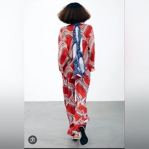 Vibrant red blouse with bold blue and white swirl patterns. Features a stylish scarf detail. Perfect for a chic look.
