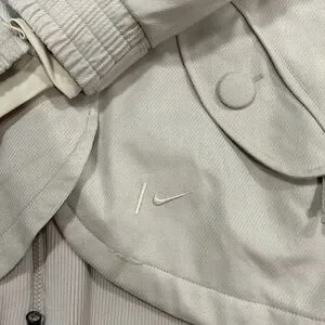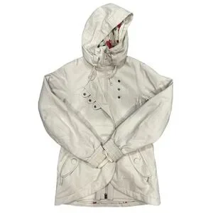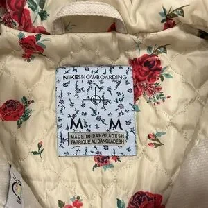 Nike Snowboarding Jacket, used and worn only a few times- gently used! The item has plenty of life left. White/ ivory/ Cream color. The inside of the item has a floral design. Thick and heavy duty material as well- item will definitely keep you warm. Buttons and zippers work perfect, item has a lot of hidden pockets as well.