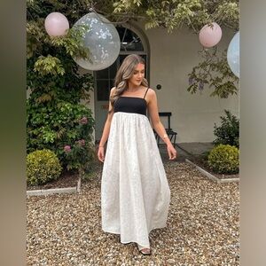 Chic maxi dress with a black top and flowing white skirt. Ideal for versatile styling.