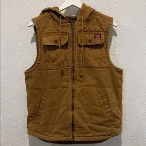 Casual Wrangler, tan vest with hood and front pockets. Features button accents.