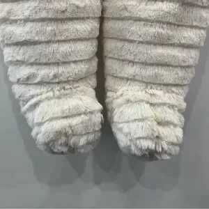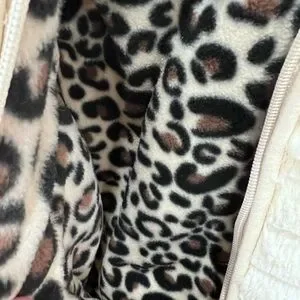 Soft and warm fleece one piece snow suit. Hand can fold up to be covered mittens. Feet are always covered. Super thick and fleece lined.