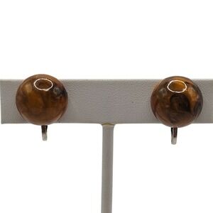 VTG Clip On Earrings Round Ball Honey Brown Swirl Lucite Resin MCM Retro Womens